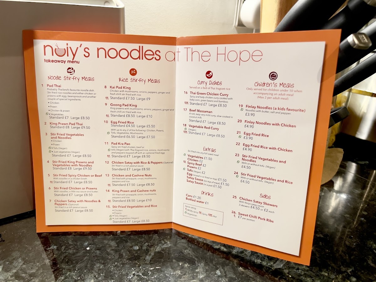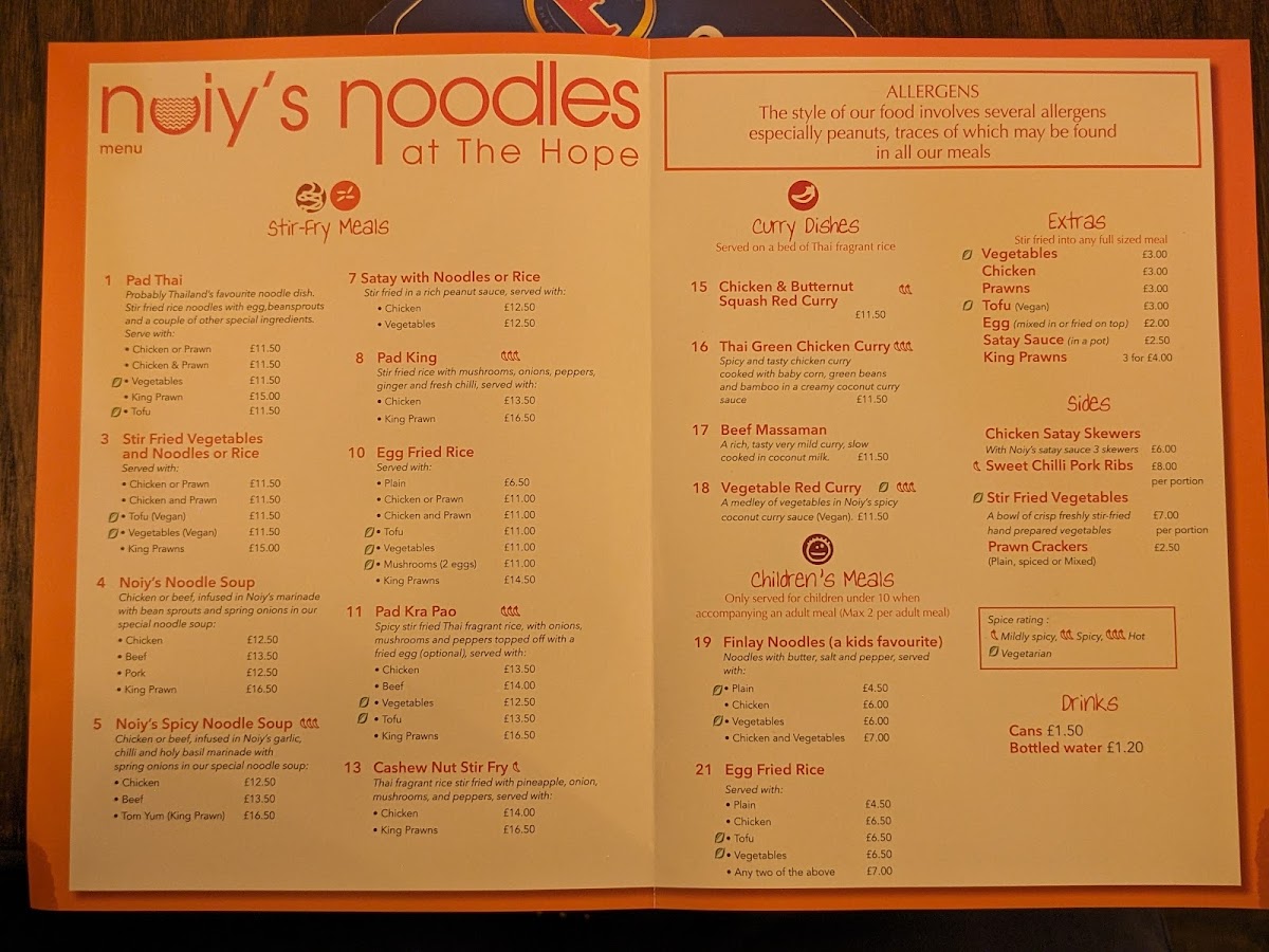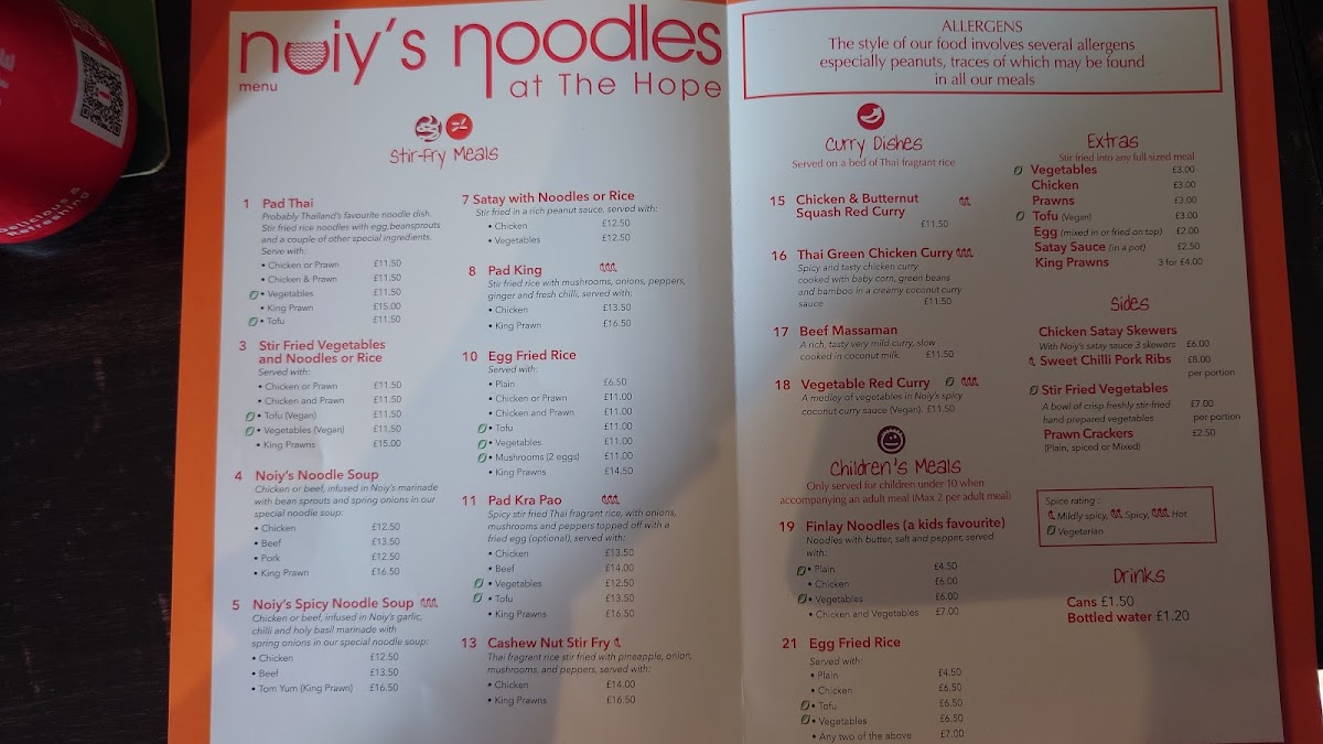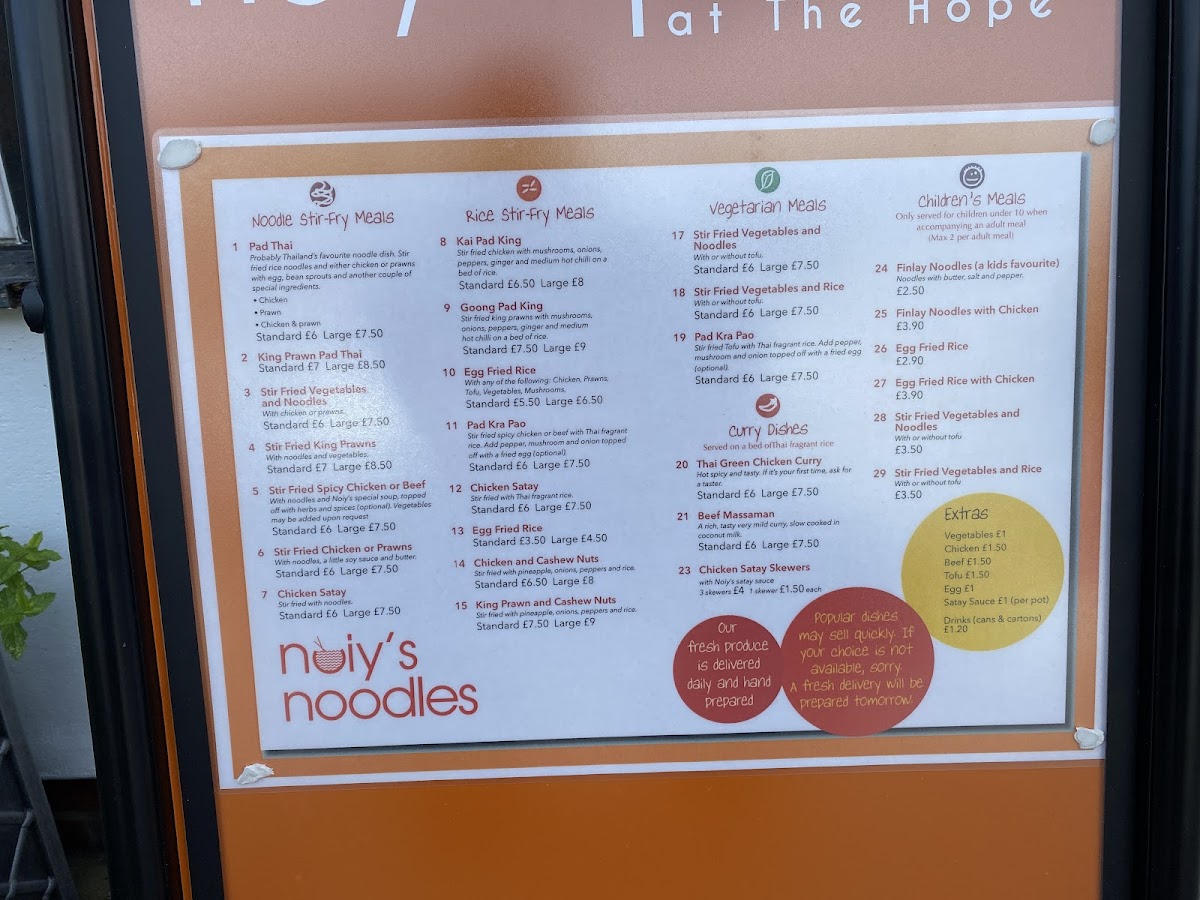 Noiy's Noodles at The Hope offers a menu grounded in simple, satisfying meals that blend Thai-inspired flavors with familiar comfort. The selection leans toward casual bites and stir-fry dishes that suit a relaxed lunch or an easy evening bite, whether you’re dining inside the cozy pub environment or enjoying the garden seating on a sunny day.